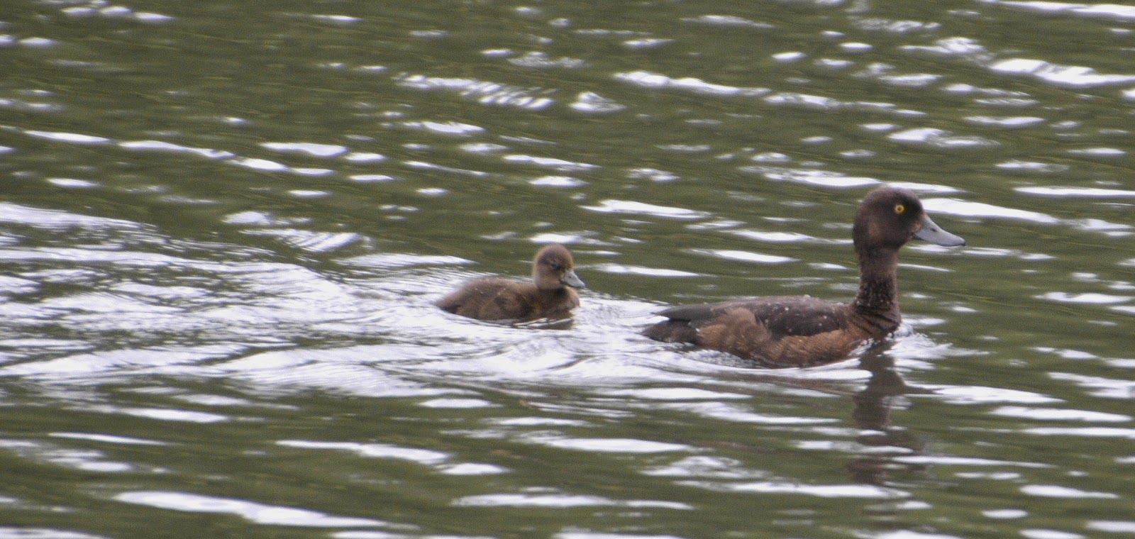Kuifeend met juveniele, een bijna jaarlijkse verschijning in de Dongevallei.