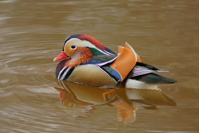 Nog meer opvallend zijn de helder oranje vlaggen op de vleugels bij het Mannetje Mandarijneend.